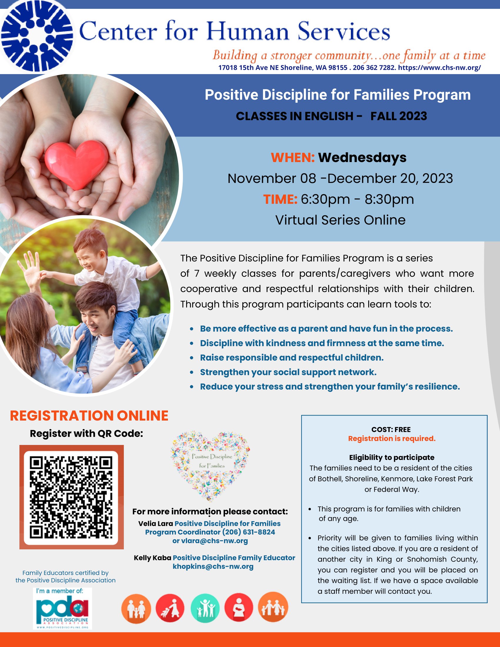 The Positive Discipline for Families Program is a series of 7 or 8 weekly classes (facilitated in English and Spanish) for parents/caregivers who want more cooperative and respectful relationships with their children.